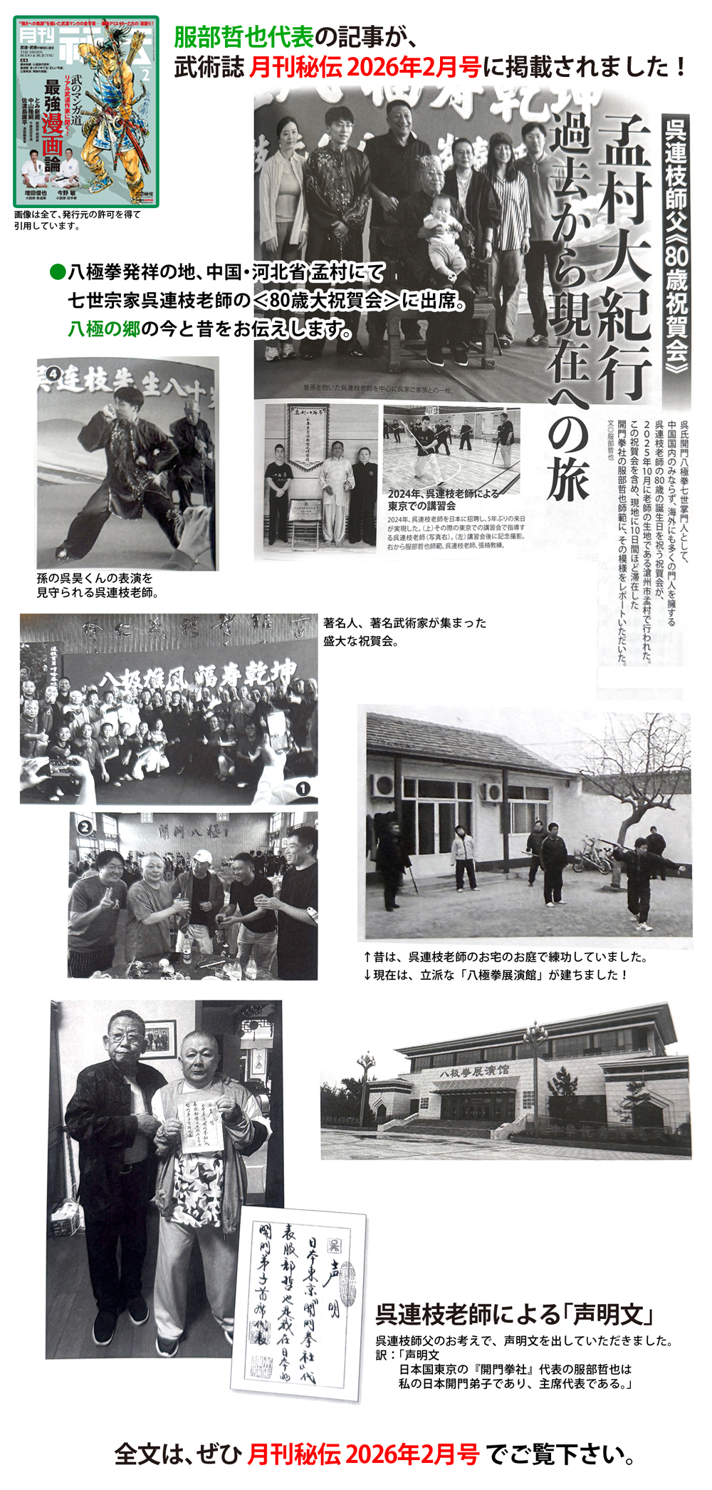 武術誌「秘伝」2026/2月号に、中国・河北省孟村で行われた<呉氏開門八極拳七世宗家 呉連枝老師の80歳大祝賀会>の記事が掲載されました!